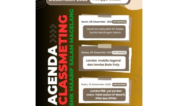 Classmeeting SMK Ma'arif Salam Magelang Kegiatan Agenda Classmeeting SMK Ma'arif Salam Magelang diselenggarakan pada Minggu Kedua Desember 2025, yaitu setelah berakhirnya As ...