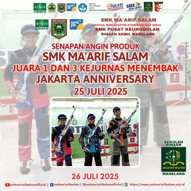 Salam, 26 Juli 2025 — Kabar membanggakan datang dari SMK Ma’arif Salam, Kabupaten Magelang. Produk unggulan Teaching Factory (TEFA) sekolah ini, yaitu senapan angin hasil karya siswa dan guru, berhasil menorehkan prestasi gemilang di ajang Kejuaraan Nasional (Kejurnas) Menembak dalam rangka Jakarta Anniversary yang digelar pada 25 Juli 2025 di Jakarta.